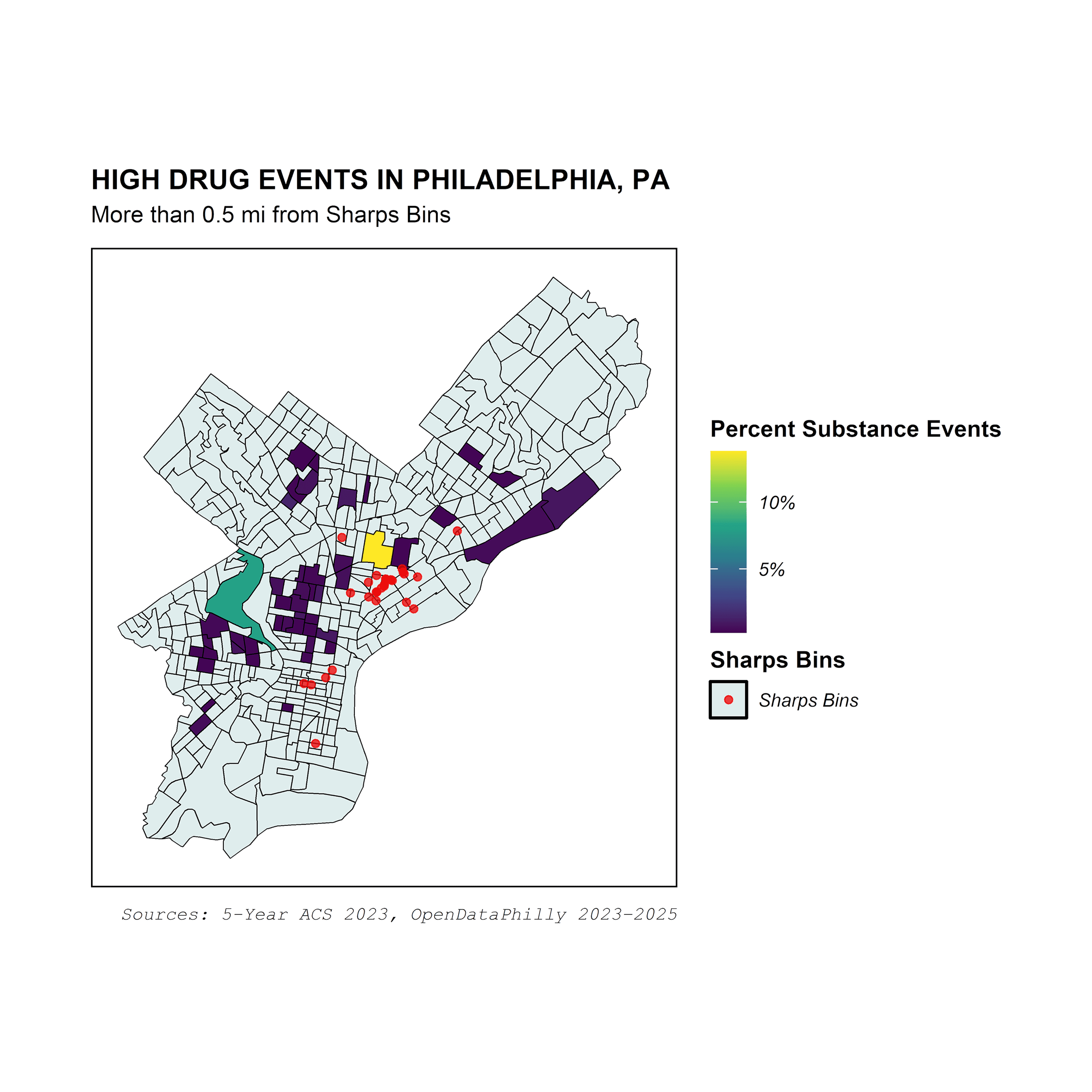 The analysis utilizes the R statistical computing environment, leveraging the sf package for vector-based spatial operations and tidyverse for data manipulation. Key methodological steps included fetching census data via the tidycensus API, normalizing demographic variables to identify vulnerable tracts based on statistical quartiles, and transforming datasets into localized Coordinate Reference Systems (e.g. PA South) for high-precision distance measurement. The core technical workflow involved generating distance matrices to calculate the proximity of tract centroids to the nearest hospitals, treatment centers, and harm reduction sites, alongside spatial joins to quantify resource density within high-incidence zones.