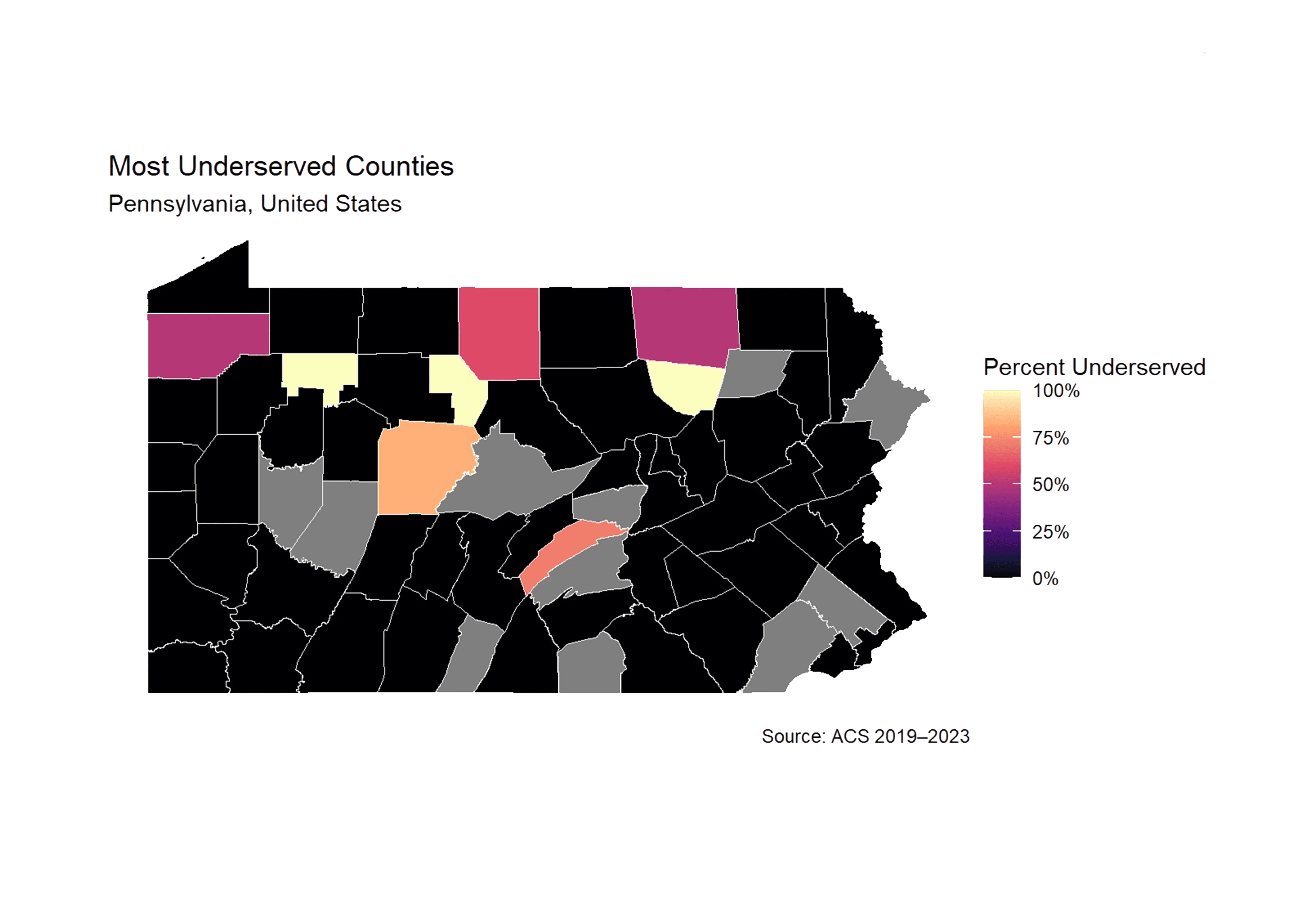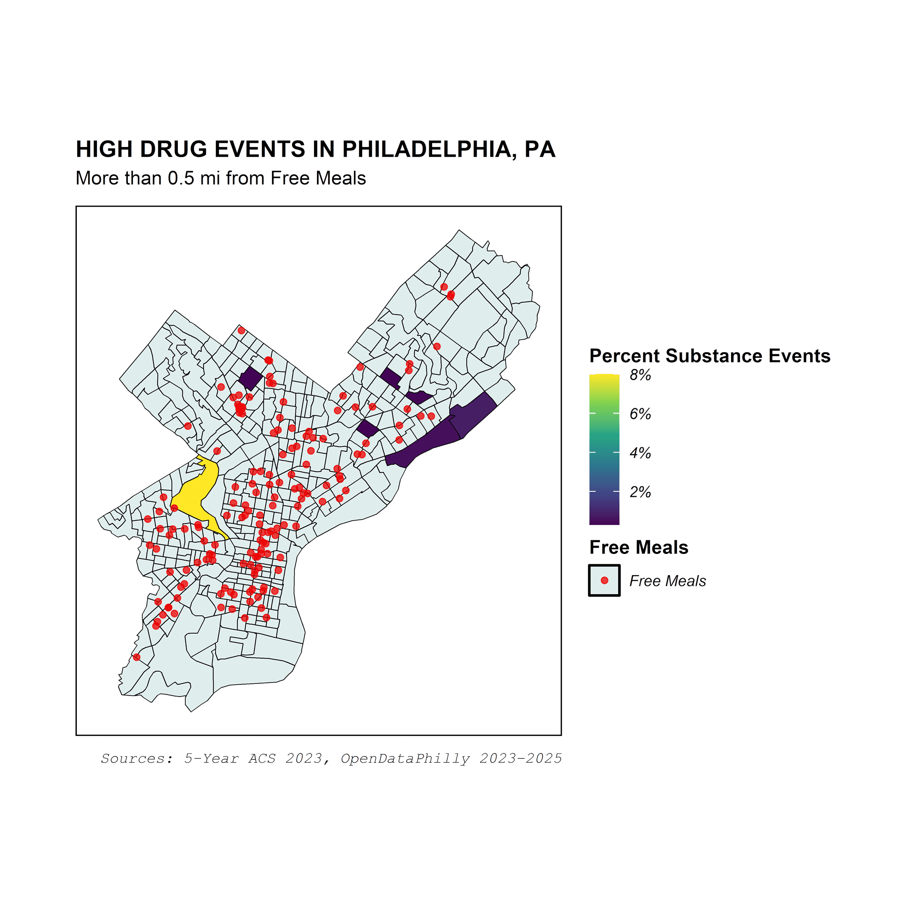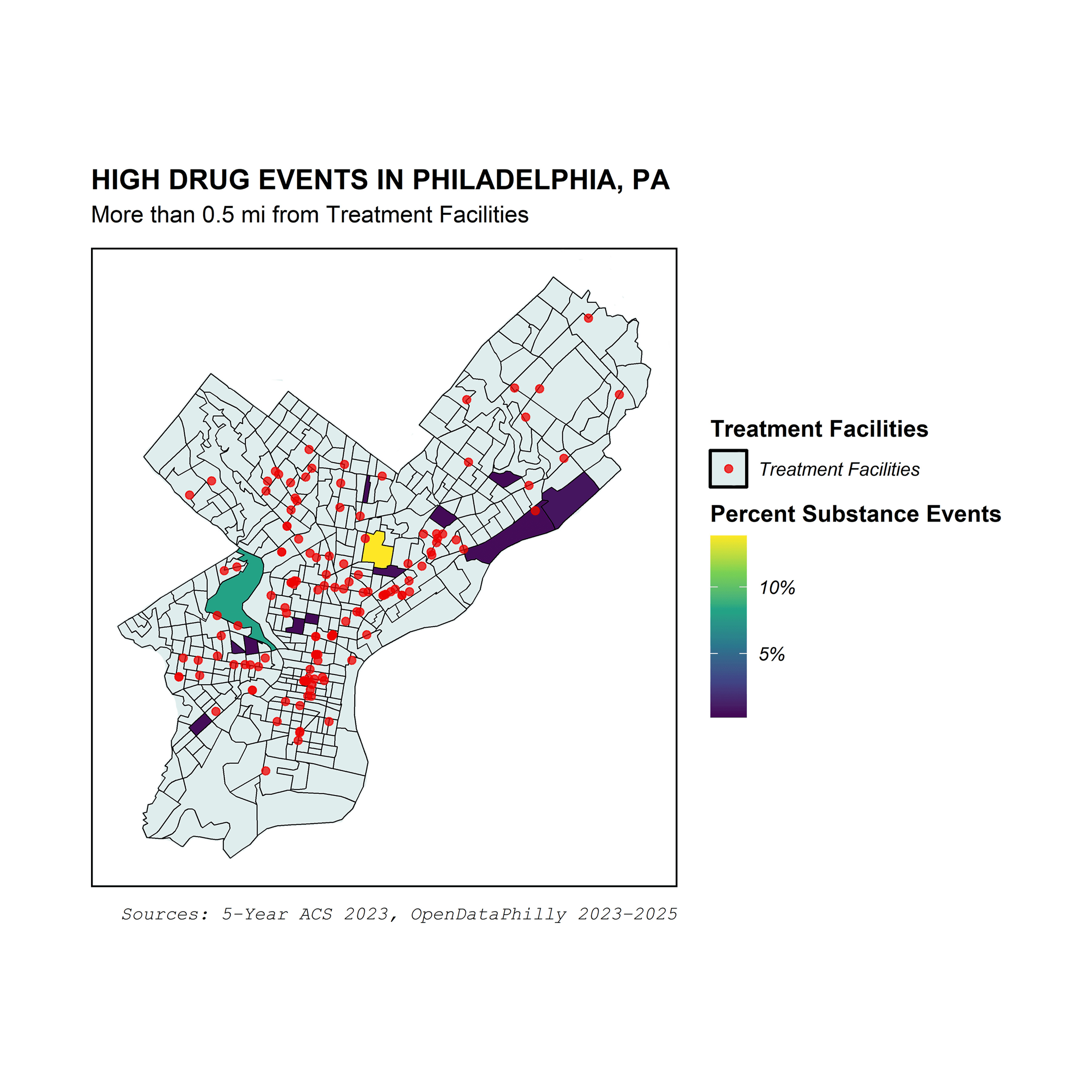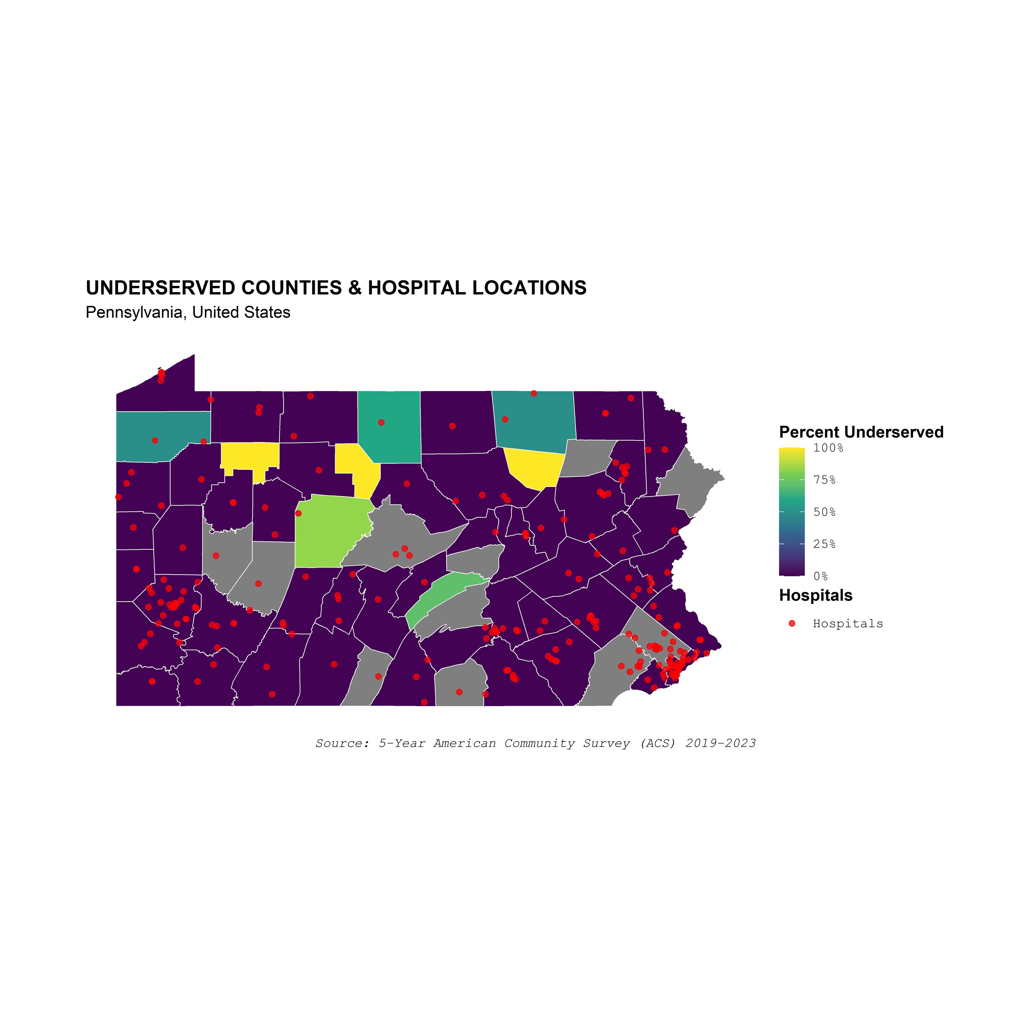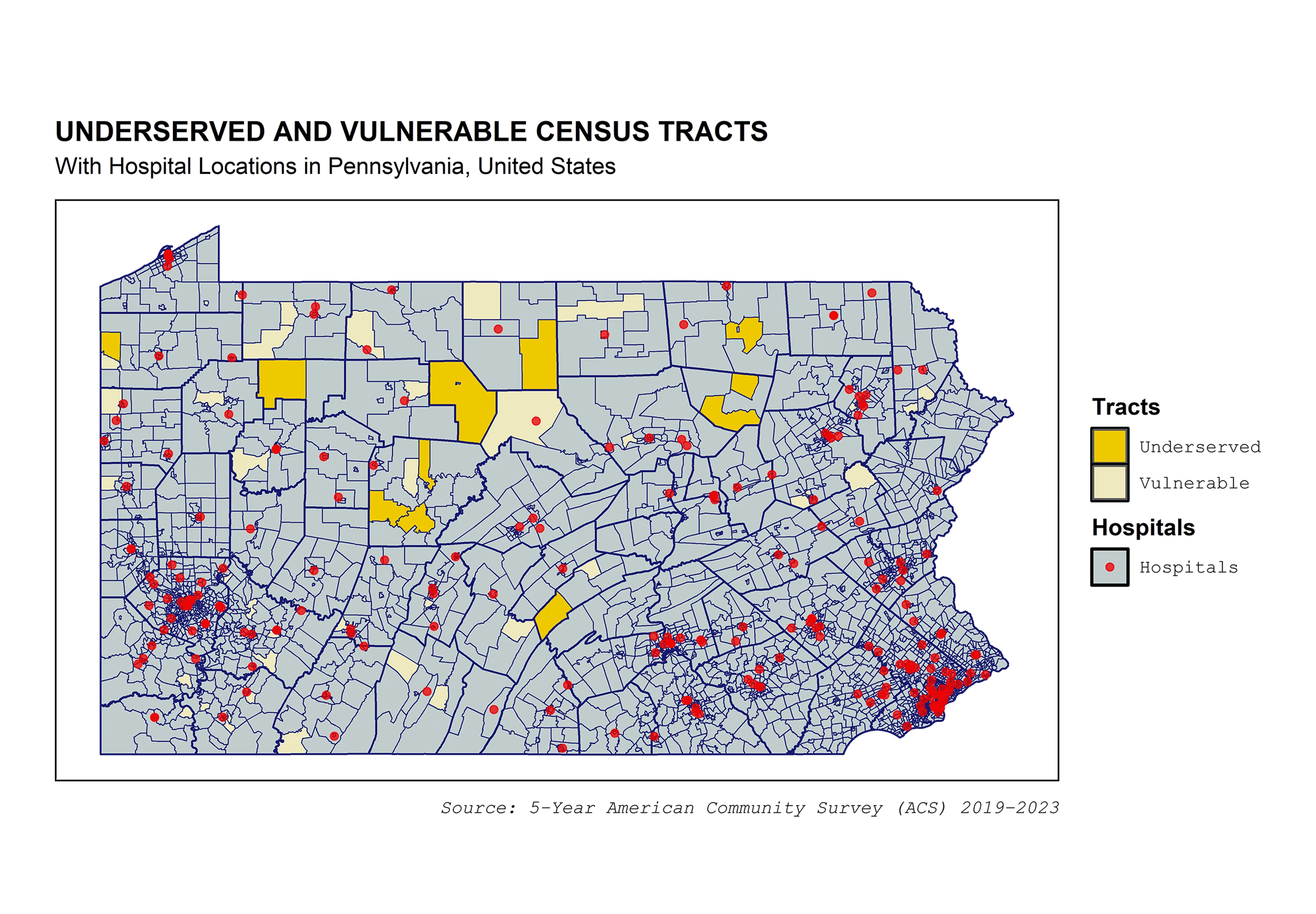 This project investigates spatial disparities in public health infrastructure across two distinct scales: statewide hospital accessibility in Pennsylvania and neighborhood-level resource allocation for substance use in Philadelphia. The primary objective is to evaluate spatial equity—determining whether vulnerable populations (defined by low income, advanced age, or high substance use incidence) disproportionately lack access to critical care. By integrating demographic data from the American Community Survey (ACS) with municipal facility locations, the study aims to pinpoint specific gaps in the social safety net that require targeted intervention.